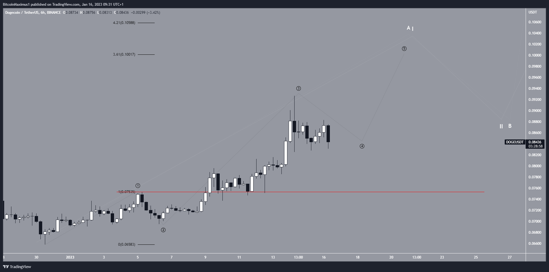 A decrease below the sub-wave one high (red line) at $0.075 would invalidate this bullish DOGE price analysis.