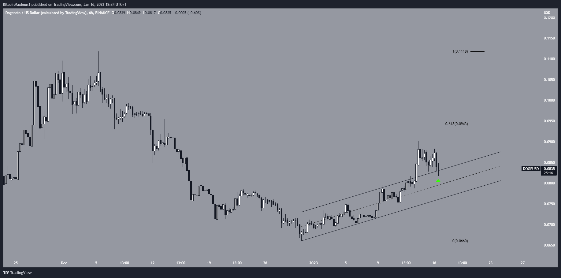 While the 0.618 Fib retracement resistance rejected the Dogecoin price, it is now validating the channel as support (green icon).
