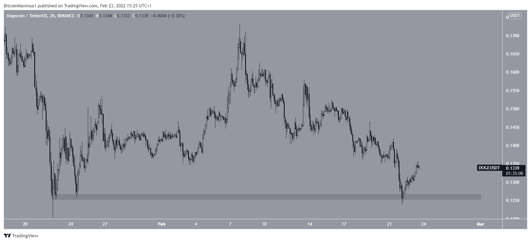 The two-hour chart shows that DOGE has bounced at the $0.125 horizontal support area. This same level initiated the previous upward movement on Jan 22. Relative to that price, this creates a triple bottom, which is also considered a bullish pattern.
