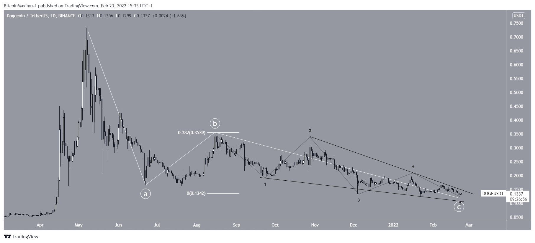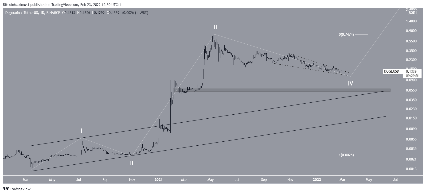 The most likely wave count does suggest that DOGE is in wave four of a five wave upward movement. However, the exact shape of wave four remains unclear.