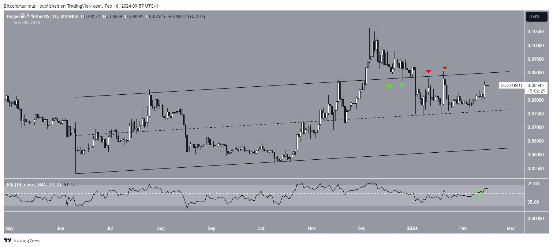 The Dogecoin (DOGE) price trades in the upper portion of a long-term pattern that has existed since June 2023.