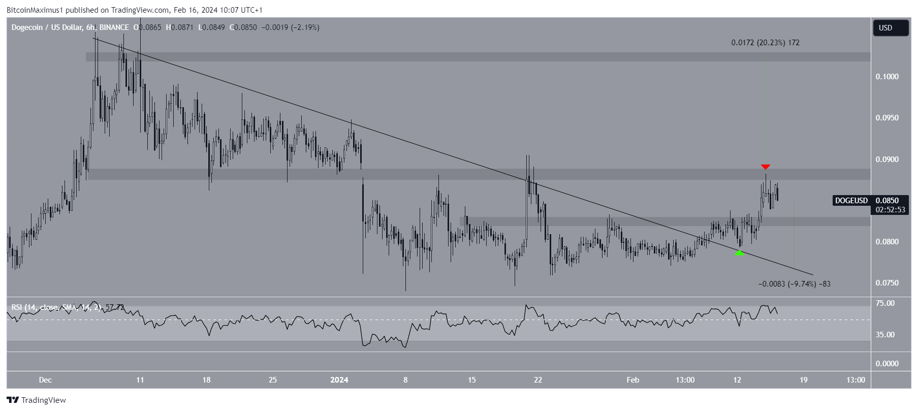 The chart shows the DOGE price broke out from a descending resistance trend line and validated it as support on February 12 (green icon). This is a common movement after breakouts that usually leads to trend continuation.