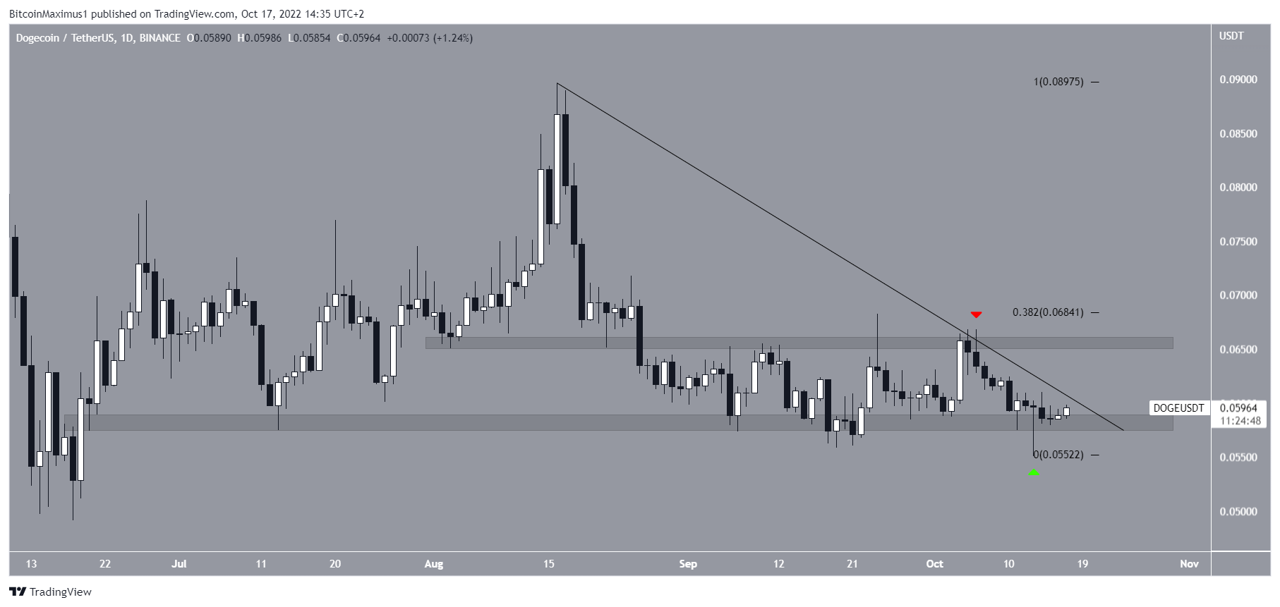 SponsoredThe rejection led to a low of $0.055 on Oct. 13. While this seemed like it caused a breakdown below the $0.058 range low, Dogecoin bounced and created a long lower wick.
