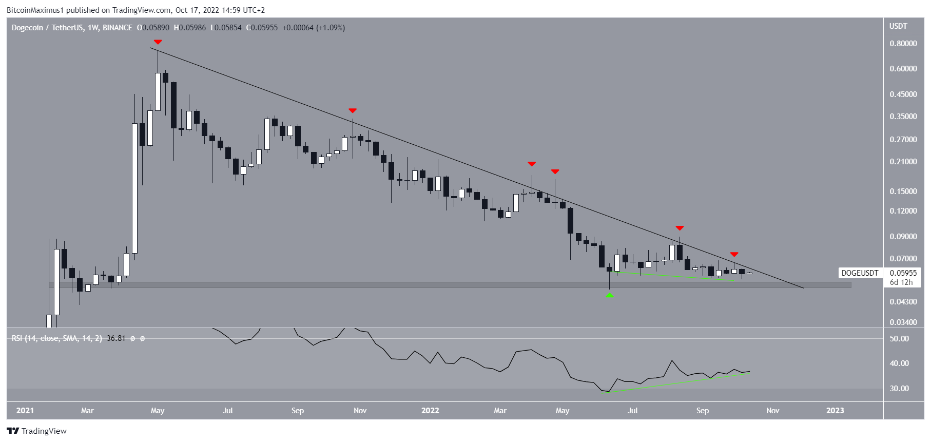 DOGE price has been decreasing since May 2021 when it reached an all-time high price of $0.073. The decrease has followed a descending resistance line.