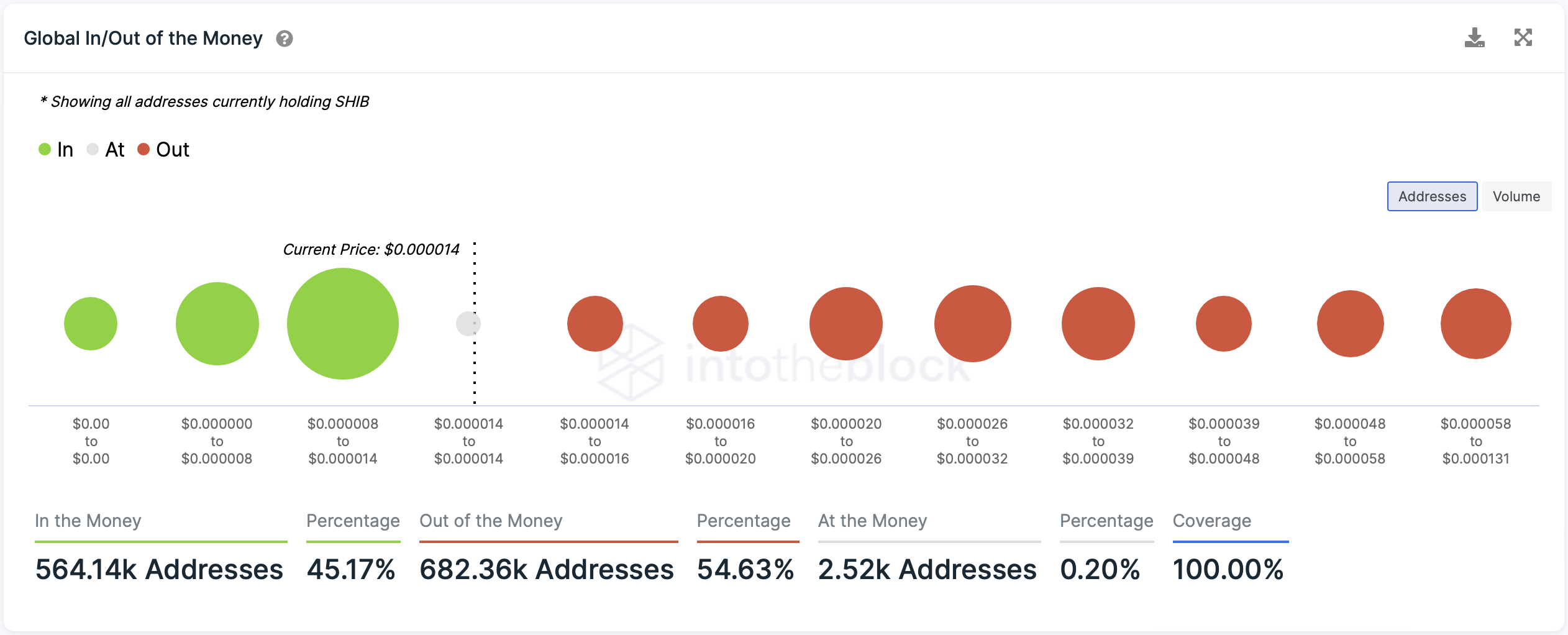In contrast to Dogecoin, most Shiba Inu holders are holding SHIB at a loss. On-chain data from IntoTheBlock shows that 55% of all addresses who have acquired SHIB are “Out of the Money” while 45% are “In the Money.”