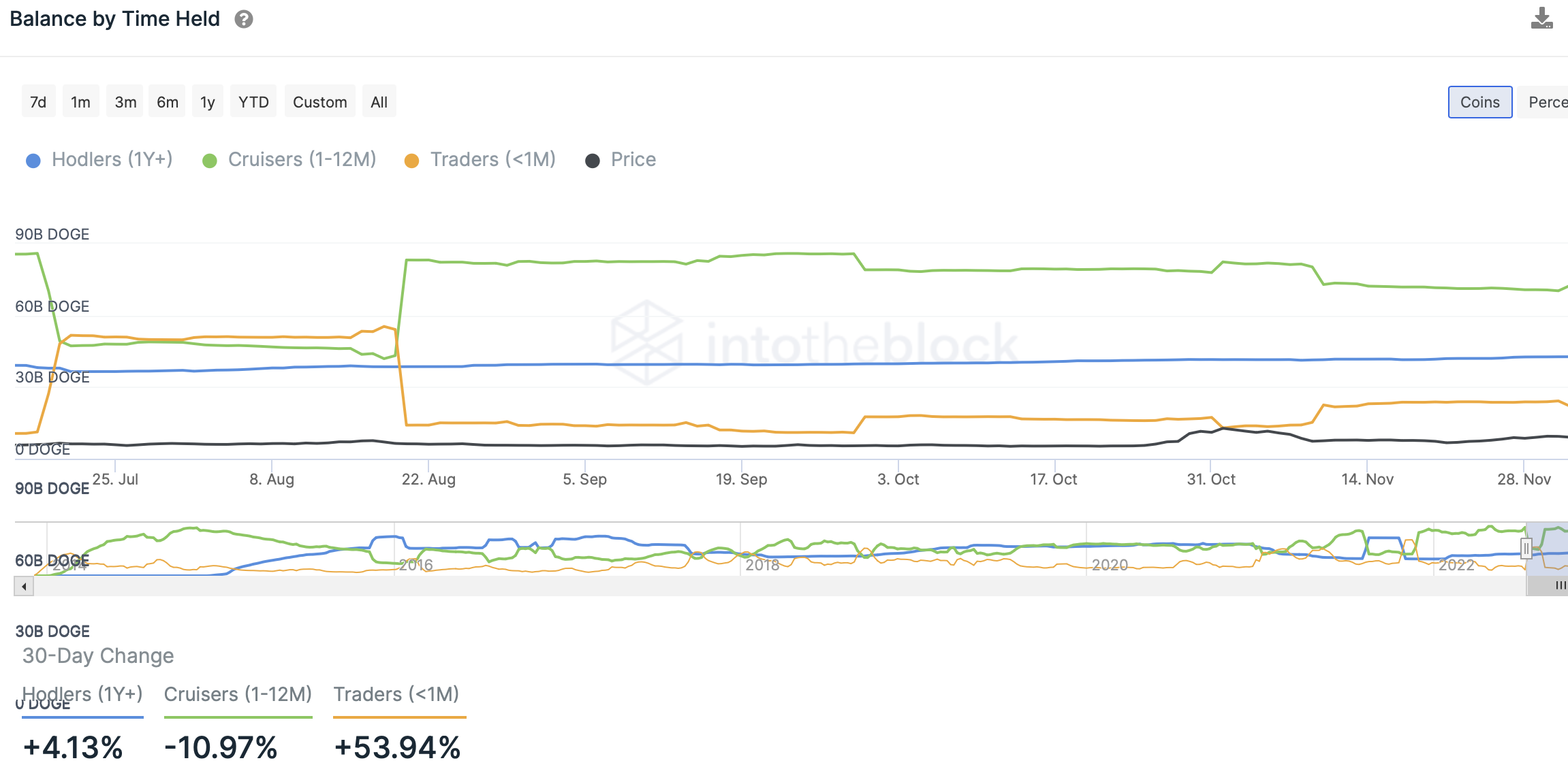 A chart of Dogecoin balances by time held highlighted that ‘trader’ balances (less than one month) had increased by 53.94% while ‘cruiser’ holdings (between one month and one year) saw a 10.97% drop.