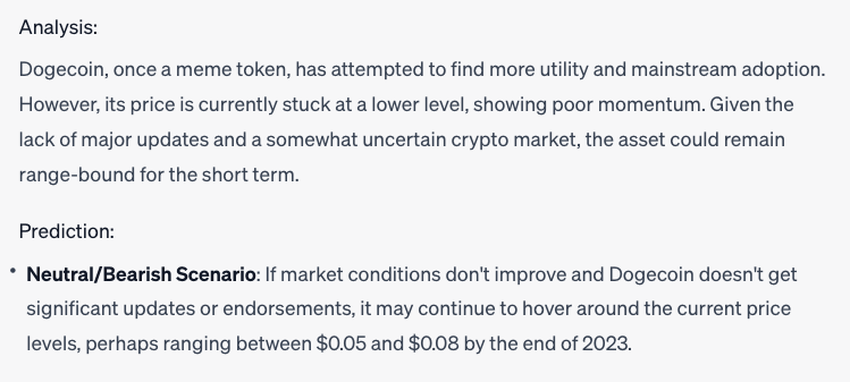 Unless investor enthusiasm improves dramatically, ChatGPT predicts DOGE will hover between $0.05 and $0.08 through the end of 2023 without a clear catalyst to break out in either direction.