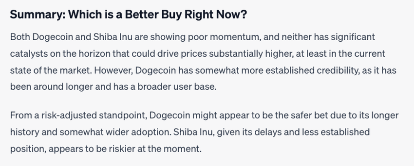Given the lackluster momentum and unclear outlook for Dogecoin and Shiba Inu, ChatGPT views neither as a solid buy right now.