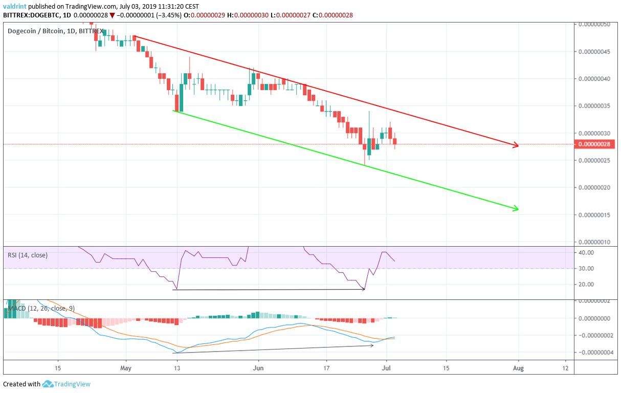 However, it is more likely that the price again touches the support line of the channel, most likely near 20 satoshis around July 10 and possibly creates a more significant divergence. That would be a more positive sign that a breakout will occur.