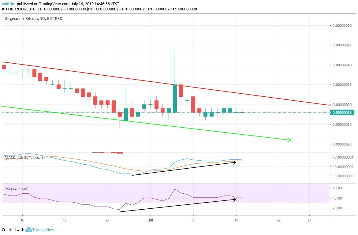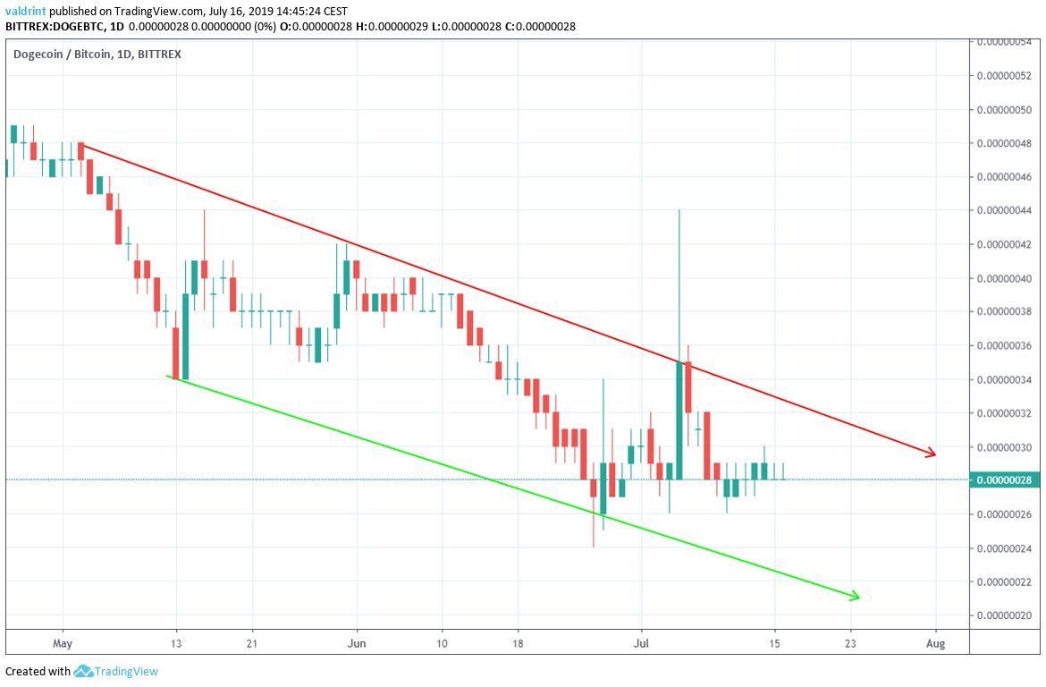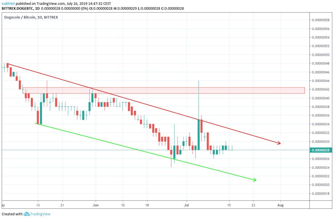 On June 26, 2019, the Dogecoin price reached a low of 24 satoshis. An upward move ensued. On July 5, DOGE reached a high of 44 satoshis. It has been decreasing since.