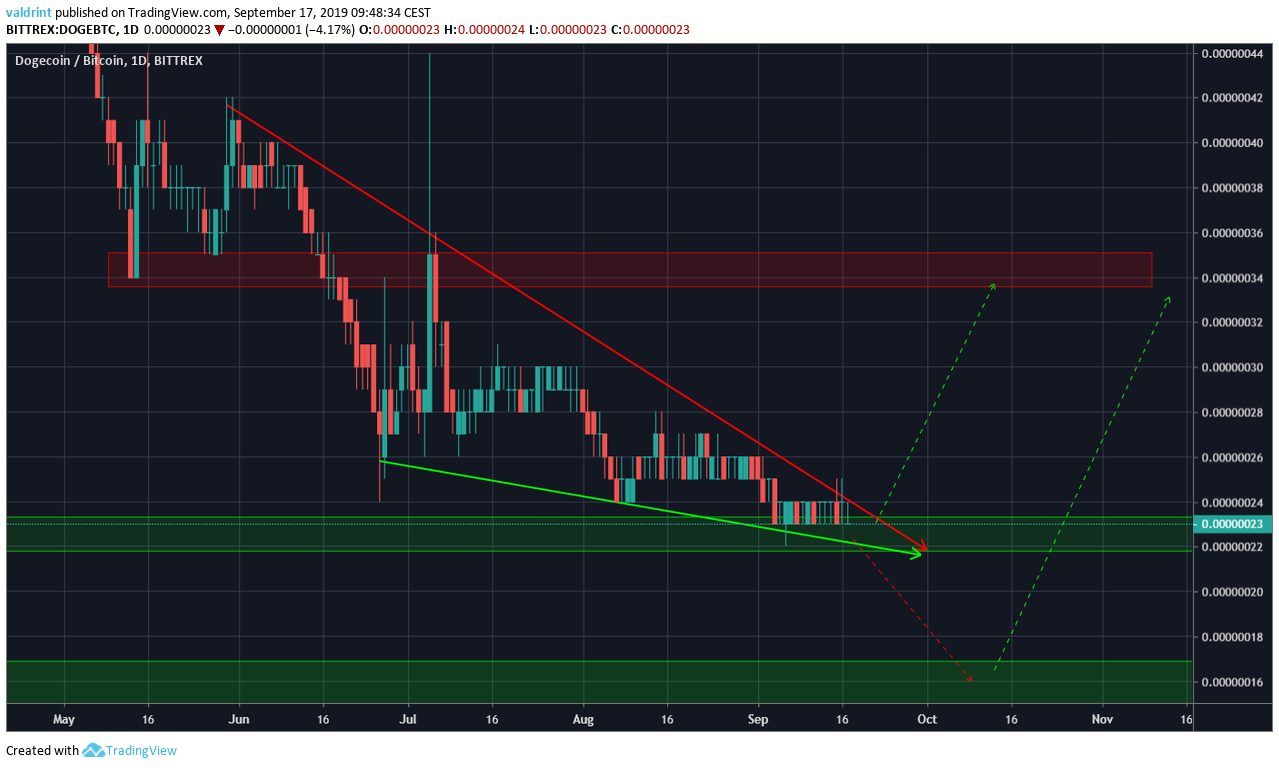 The Dogecoin price is approaching the end of the wedge, which is projected to be at the beginning of October.
