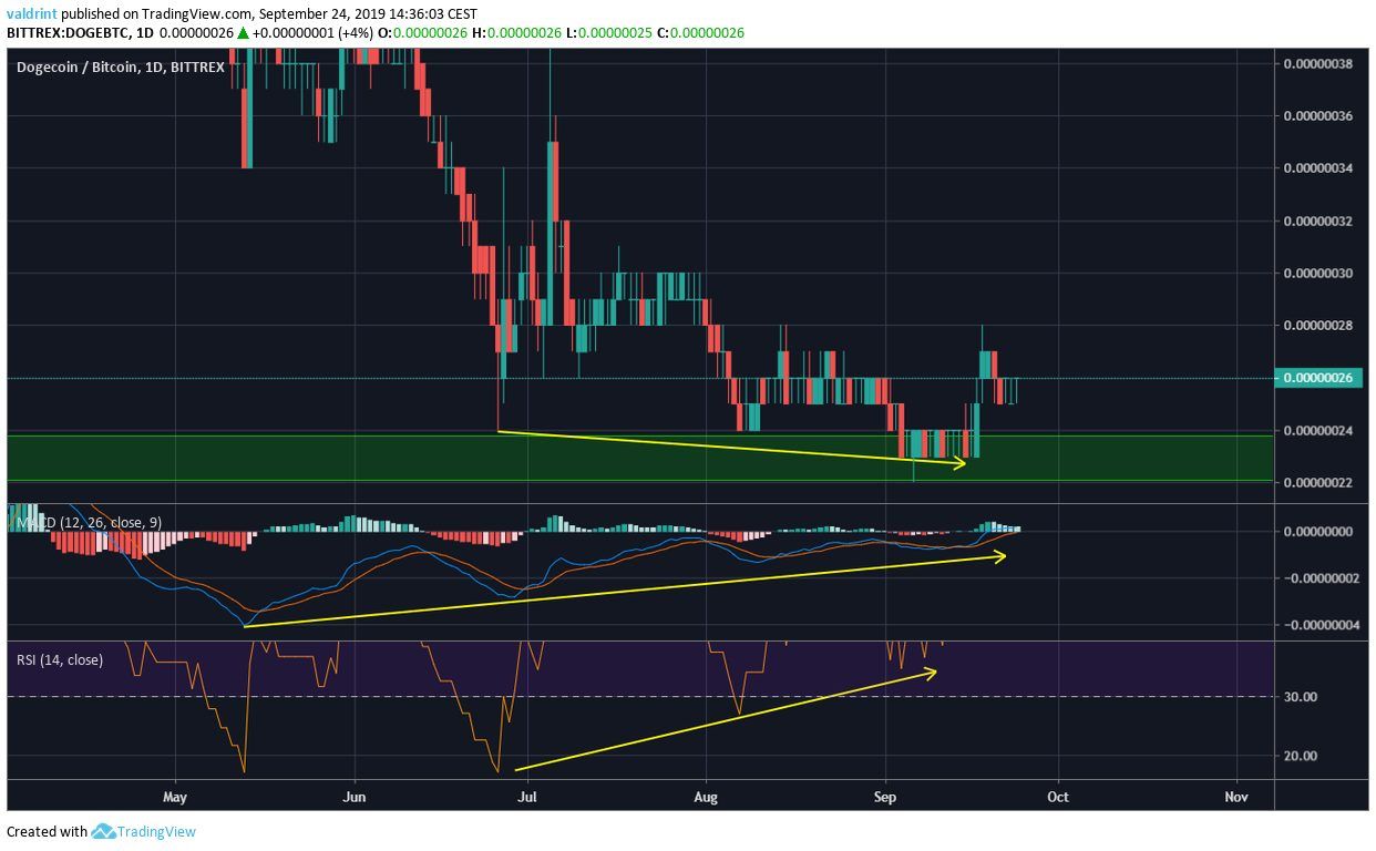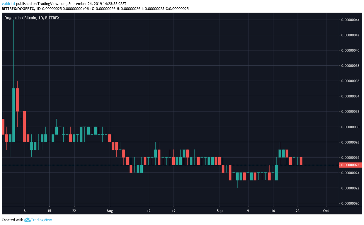 On July 5, 2019, the DOGE price reached a high of 44 satoshis. A downward move ensued. On September 4, DOGE reached a low of 23 satoshis. After trading near this level for the first half of September, it seemingly initiated an upward move on September 17.