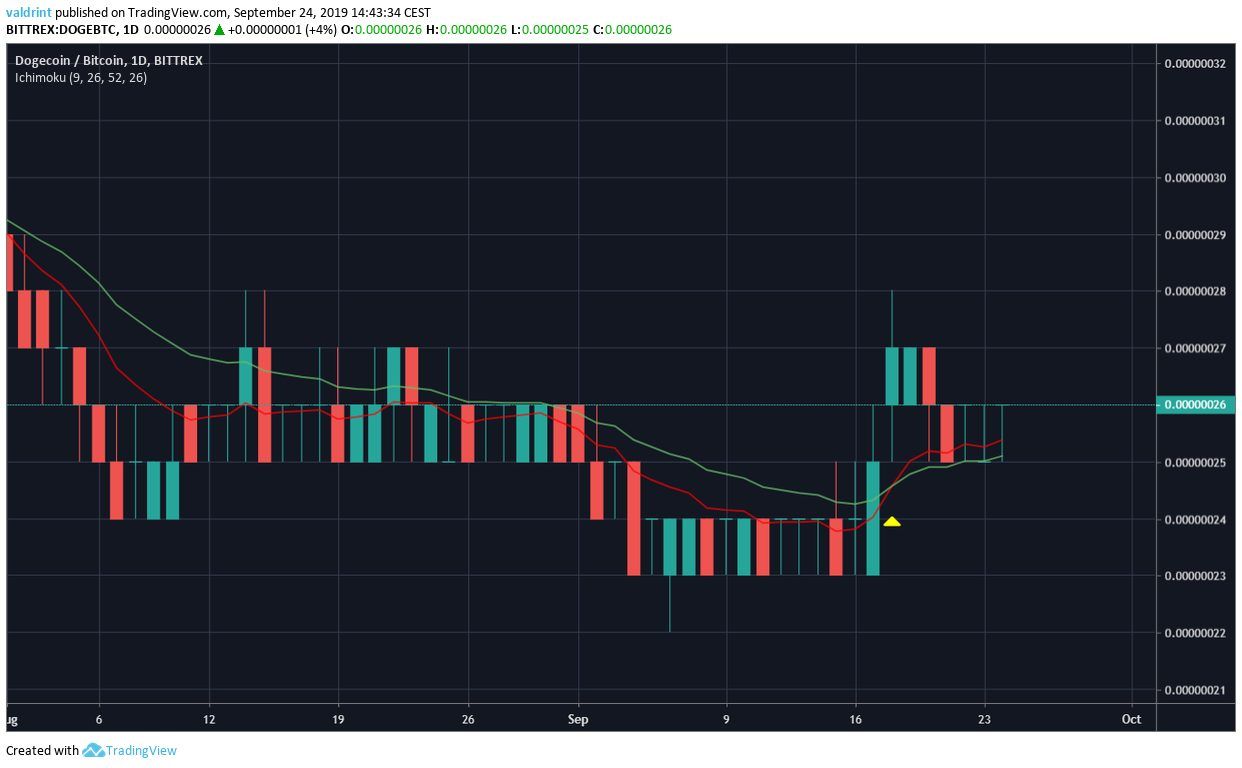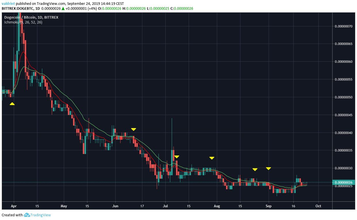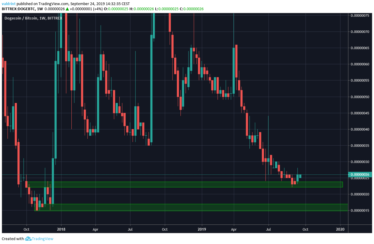 For hypothetical trading purposes, we consider DOGE a buy near the current price of 26 satoshis.