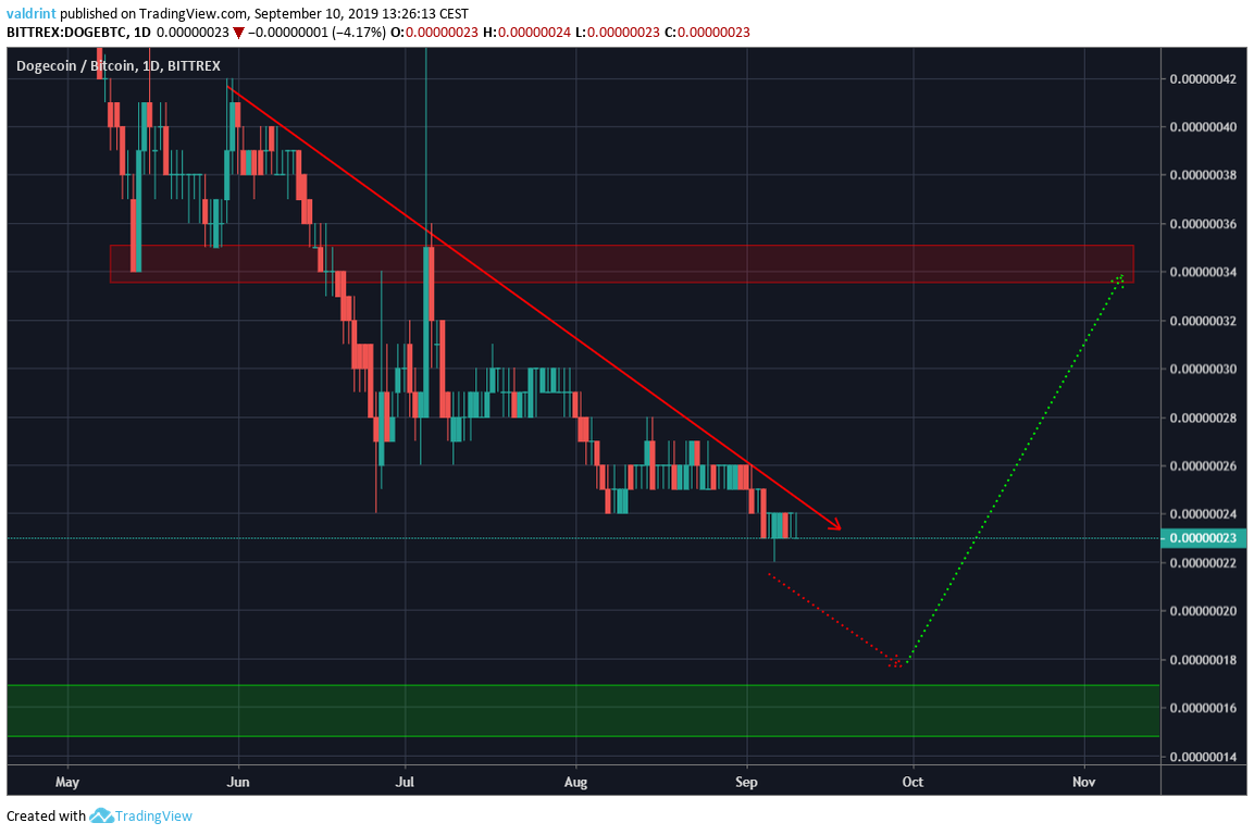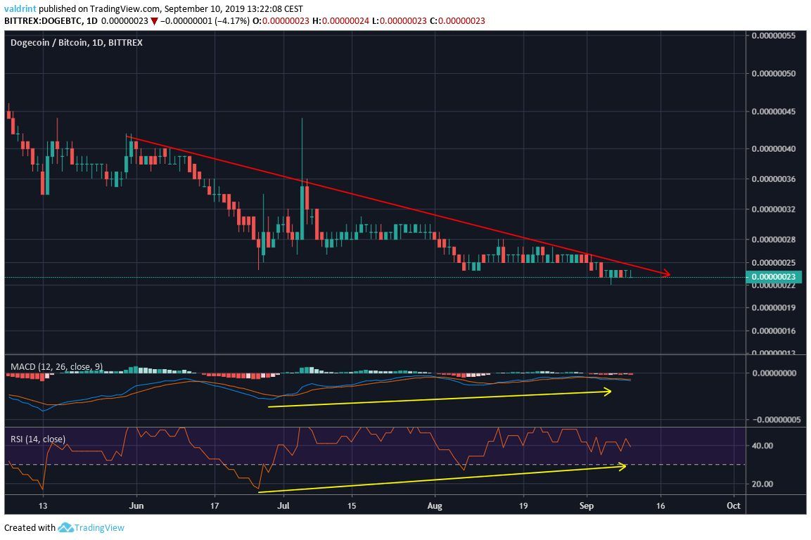 - DOGE/BTC is following a descending resistance line.