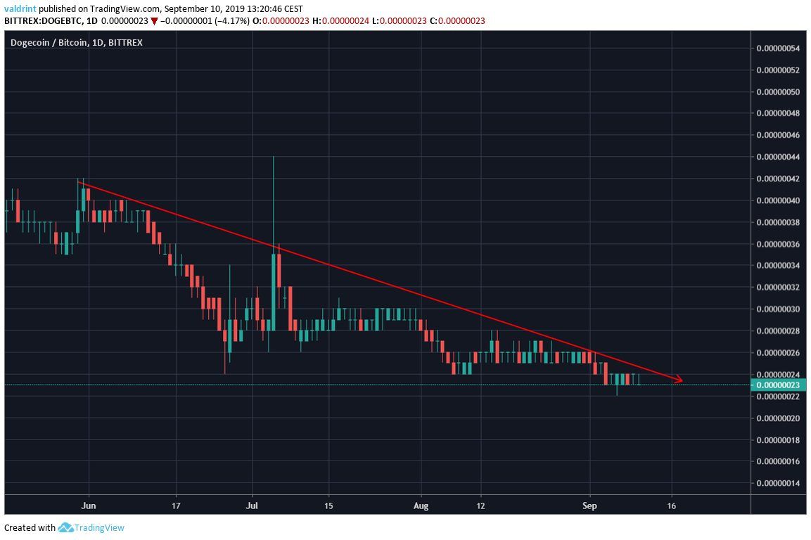 On April 4, 2019, the Dogecoin price reached a high of 85 satoshis. A rapid decrease followed. The price has been on a downtrend since. However, the rate of decrease has slowed down considerably since late June.