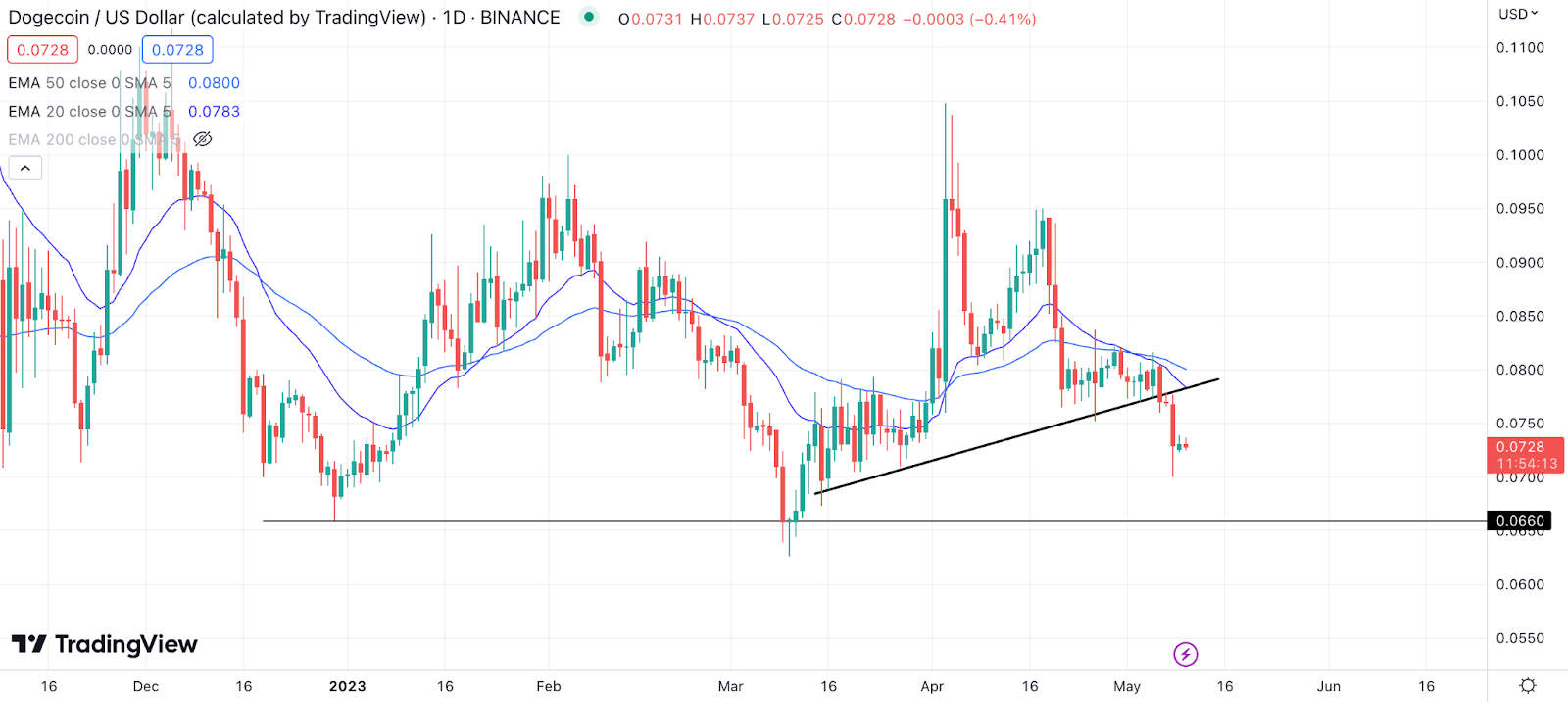 The crypto market continues to face turbulence, with Dogecoin (DOGE) struggling to maintain its price momentum. DOGE’s value has fallen by 22% since mid-April and is now trading around the $0.072 level – 90% lower than May 2021’s all-time highs.