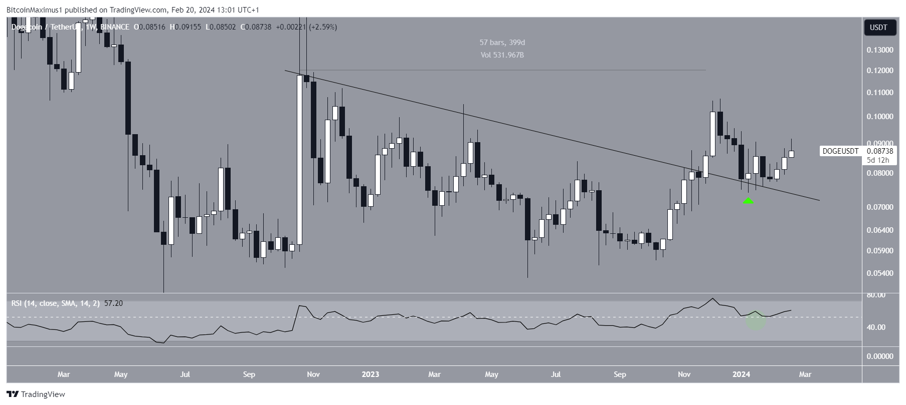 The weekly time frame technical analysis shows the DOGE price broke out from a descending resistance trend line in November 2023. Before the breakout, the trend line had existed for 400 days. DOGE reached a high of $0.107 before falling.
