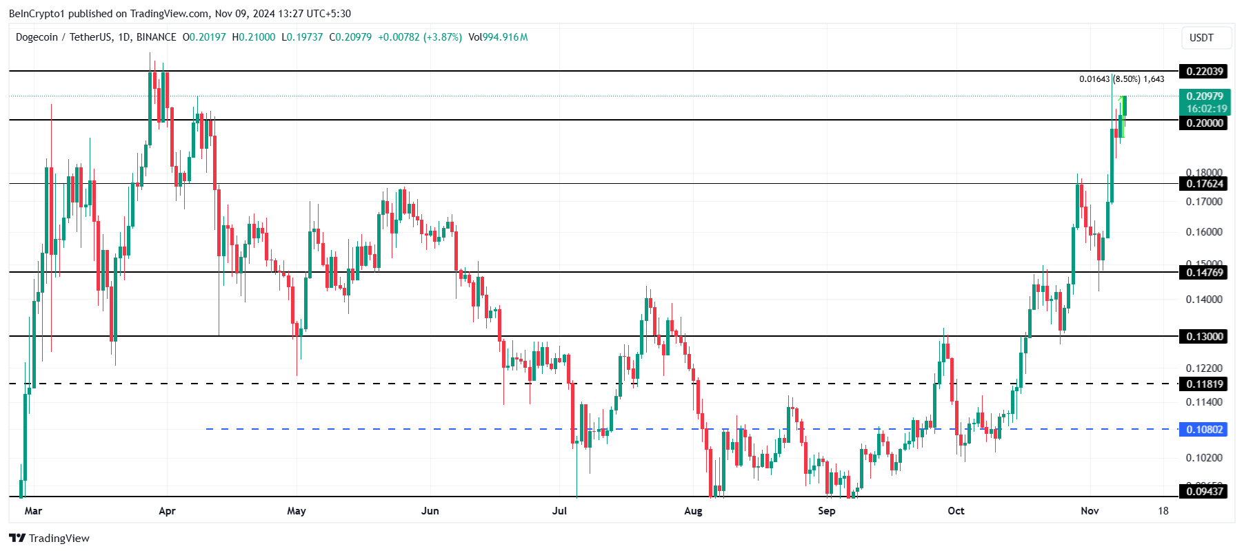 Dogecoin’s price has been up by 8.5% over the past 24 hours, trading at $0.209. If DOGE can breach the critical resistance level of $0.220, it would mark a new seven-month high, reinforcing its strong position in the crypto market. A break past this level would signal renewed bullish strength.