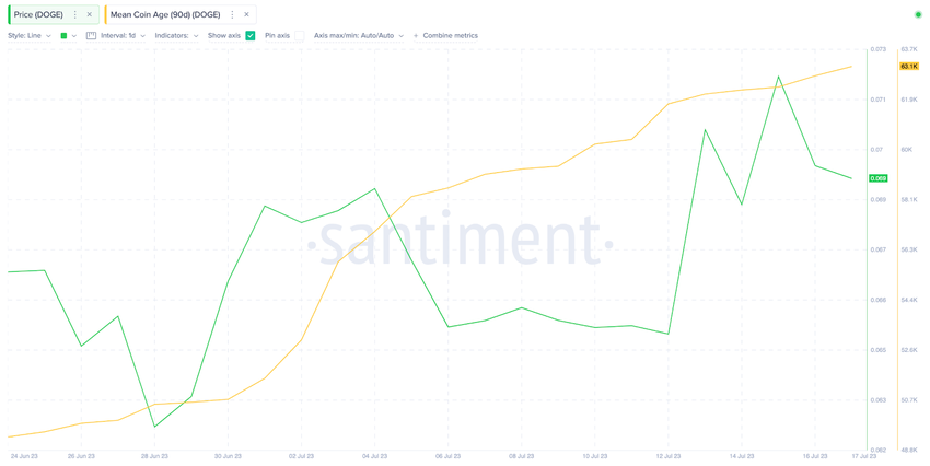 Evidently so, between July 1 and July 17, Dogecoin Mean Coin Age increased by 22% from 55,151 to about 63,131.