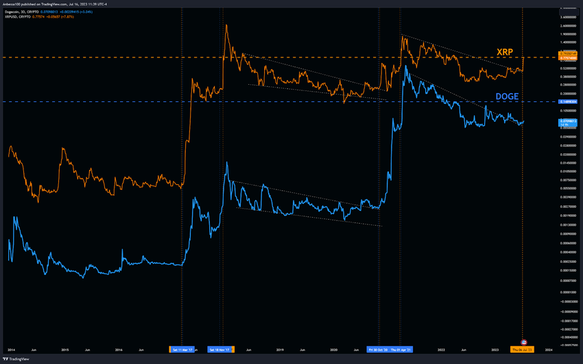 Dogecoin and XRP have displayed a conspicuous fractal correlation over the last 9 years. The Tradingview chart below shows that, albeit at different intensities, DOGE and XRP have often trended in the same direction.