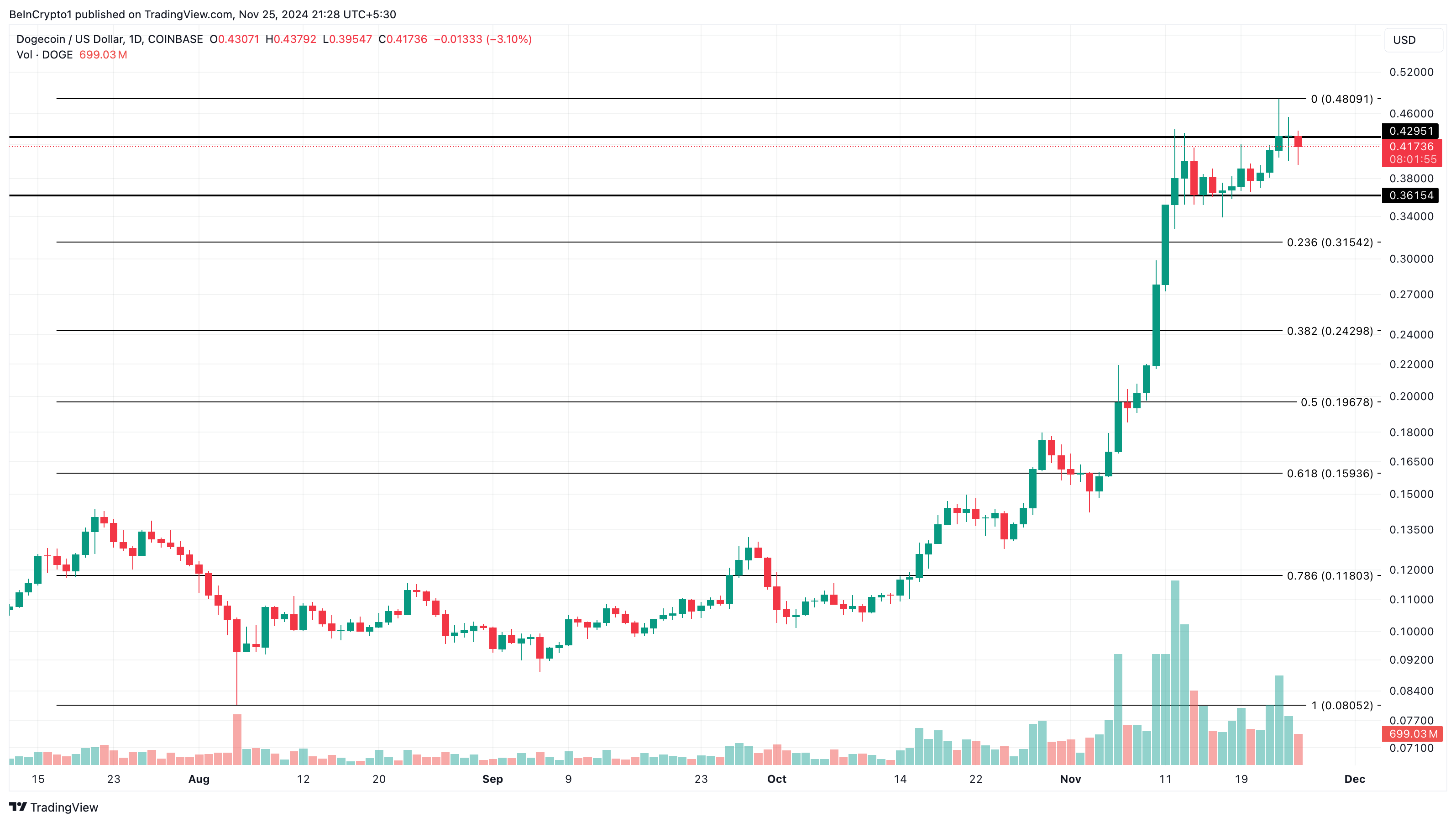 A further look at the daily chart shows that Dogecoin’s price experienced resistance at $0.43. This decline was one reason the cryptocurrency failed to rally to $0.50. It is also important to mention that trading volume dropped, making it challenging for the uptrend to continue.