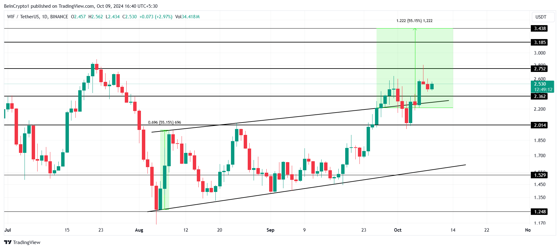 If WIF successfully breaks out, it has the potential to chart a 55% increase. Currently, the meme coin is 36% away from its next target of $3.43. Breaching and flipping the $2.75 resistance into support would be a key step in pushing WIF toward this target.
