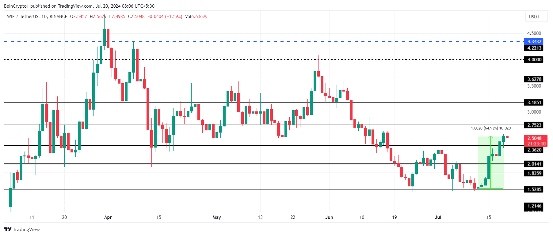 WIF price, after a 65% rise, is trading at $2.5 after rising from $1.5 over the past seven days, inching closer to the resistance at $2.7. Flipping this barrier into support is crucial for the meme coin as it could guide a rally to $3.0 and beyond.