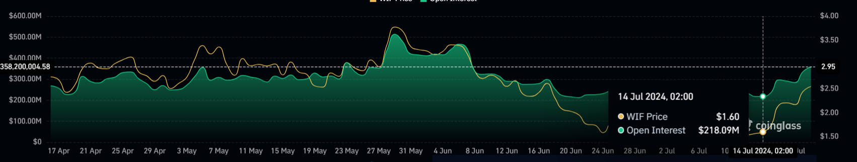 The broader market bullishness has sparked a noticeable increase in WIF price as well as investor participation. This surge in confidence and activity has led to a significant rise in the open interest (OI) for WIF.