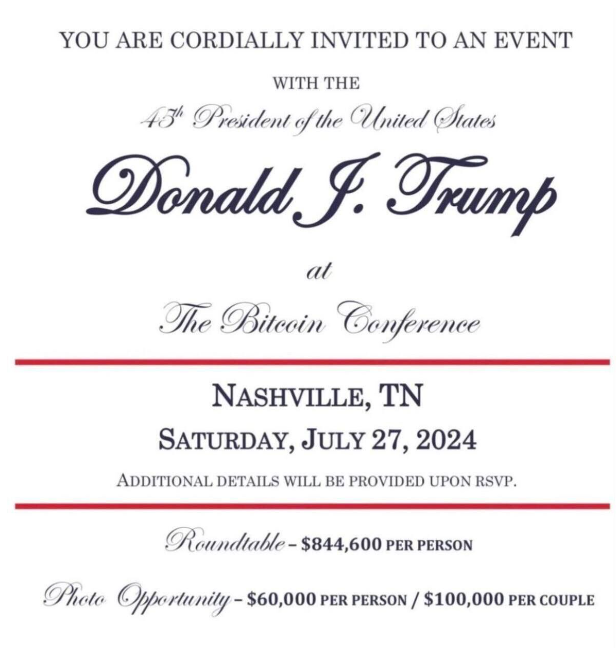 Former US President Donald Trump has set a high price tag for his crypto community supporters—$844,600 for a seat at a private roundtable during the upcoming Bitcoin Conference 2024 in Nashville.