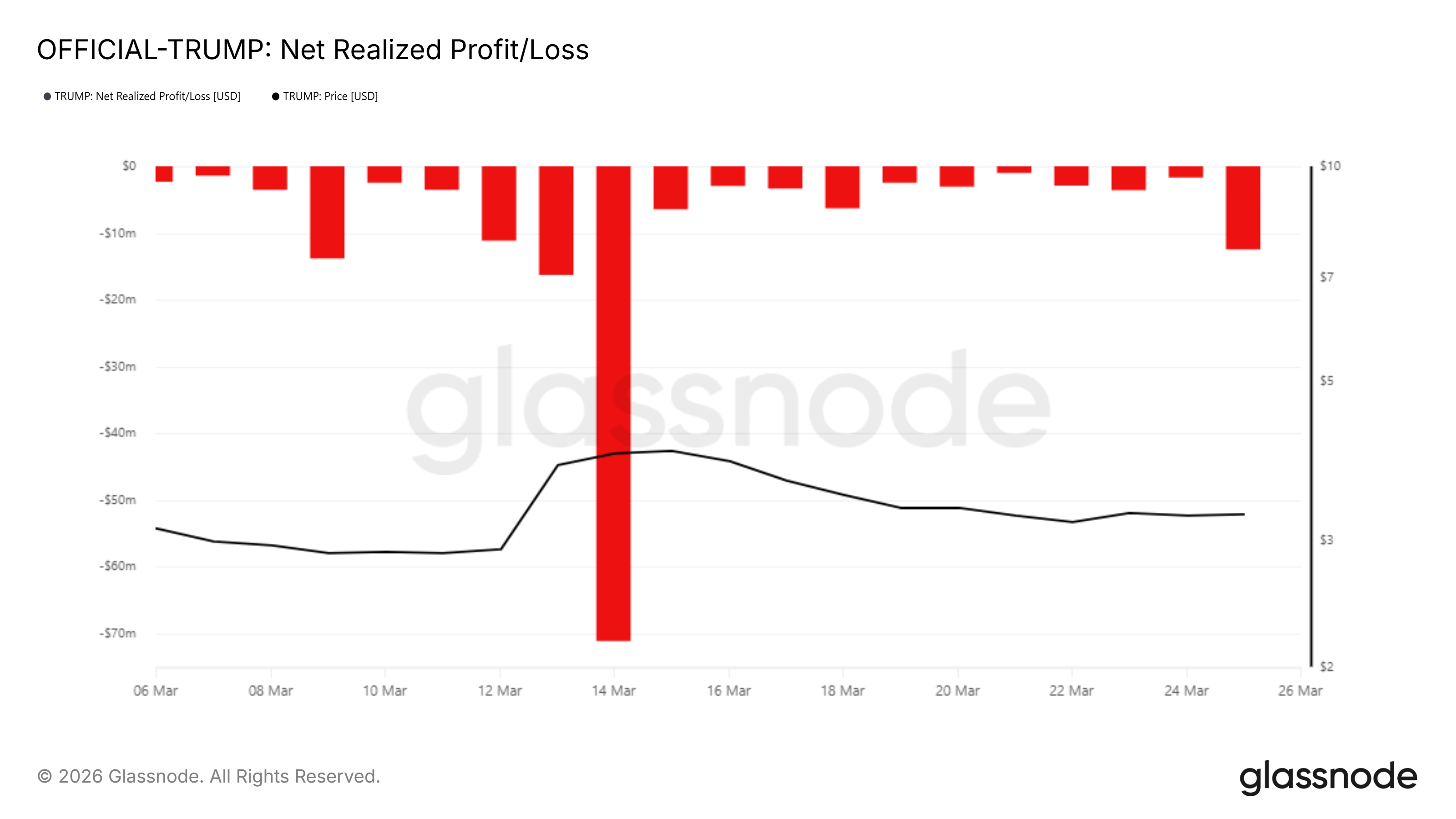 The net realized profit/loss chart for TRUMP from March 6 through March 25 shows an uninterrupted sequence of red bars below the zero line. Not a single day in that span recorded a net realized gain for holders.
