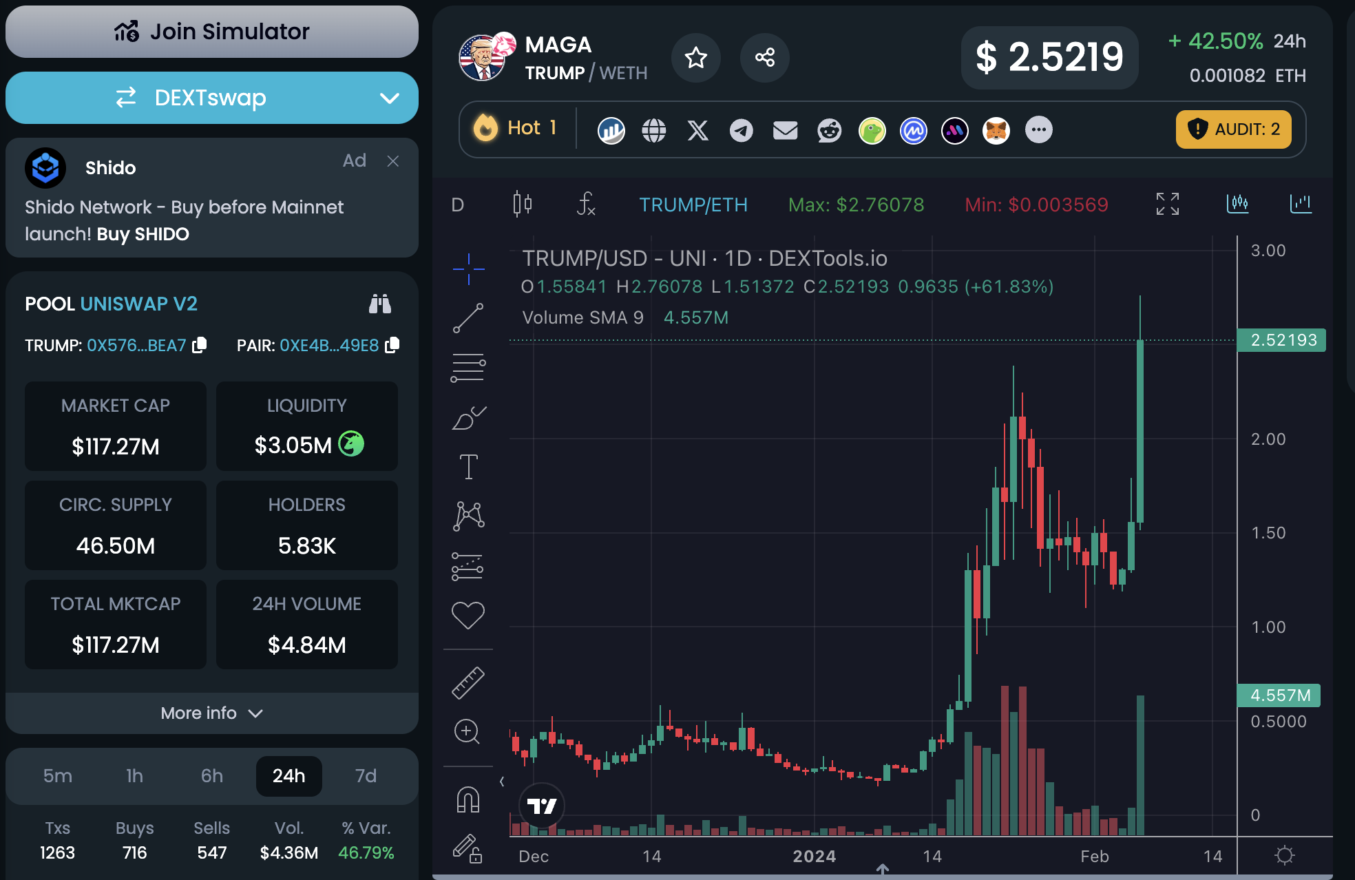 DexTools data confirms the increasing interest in MAGA’s TRUMP token. It boasts a market capitalization of over $117.27 million. It also recorded trading volumes of $4.84 million in the last 24 hours.