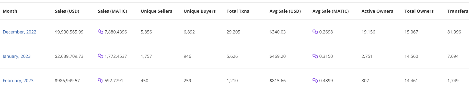 According to OpenSea, creator Billy Zanker pockets a 10% royalty from each NFT’s secondary sale, with one recent sale bagging Zanker $4,400. The collection’s floor price peaked at 1.2 ETH on Dec. 15, 2022, before falling to 0.179 ETH on Jan. 10, 2023. It has since risen to 0.59 ETH. The Polygon-based collection has accrued $4 million in primary sales revenue.