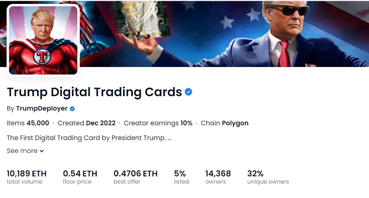 Donald Trump’s Trump Card NFT collection has earned over $16 million in revenue on secondary NFT marketplace OpenSea, even as the collection’s floor price falls to about 0.5 ETH.