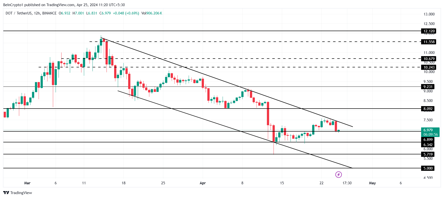 Polkadot’s price, trading at $6.9 at the time of writing, is struggling to maintain $7 as a support floor. Stuck within a descending channel, the altcoin shows relatively stronger resistance.
