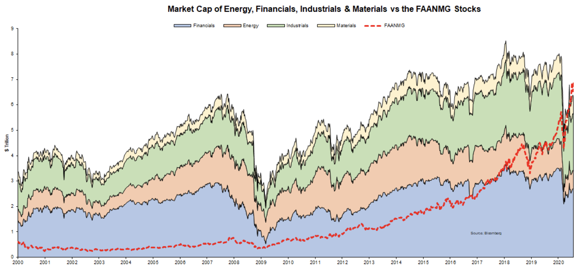 The rise was led chiefly by tech stocks: Facebook, Amazon, Apple, Netflix, Microsoft, and Google (FAANMG). Tech giants are now worth more than $7 trillion, greater than the combined total market capitalization of the financial, energy, industrial, and material sectors.
