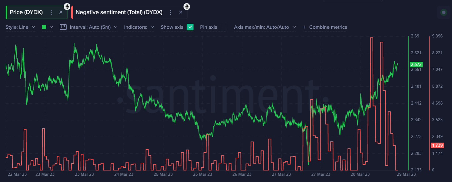 dYdX (DYDX) has seen a significant spike in negative sentiment, according to social data from the Blockchain forensics platform Santiment. Since the spike in negativity happened on March 28, DYDX has seen a price increase of close to 7%.