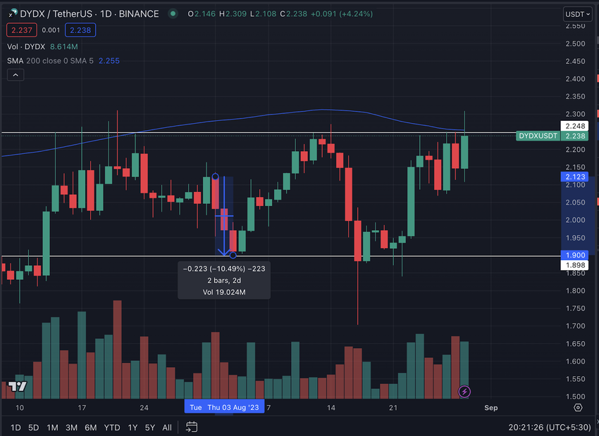 The screenshot below shows that since mid-July, DYDX has remained range-bound between $2.248 to $1.899. Currently, it is testing the resistance at $2.248