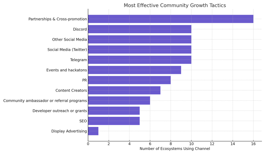 This bar chart displays how frequently various social media platforms are mentioned as part of crypto ecosystem growth strategies.