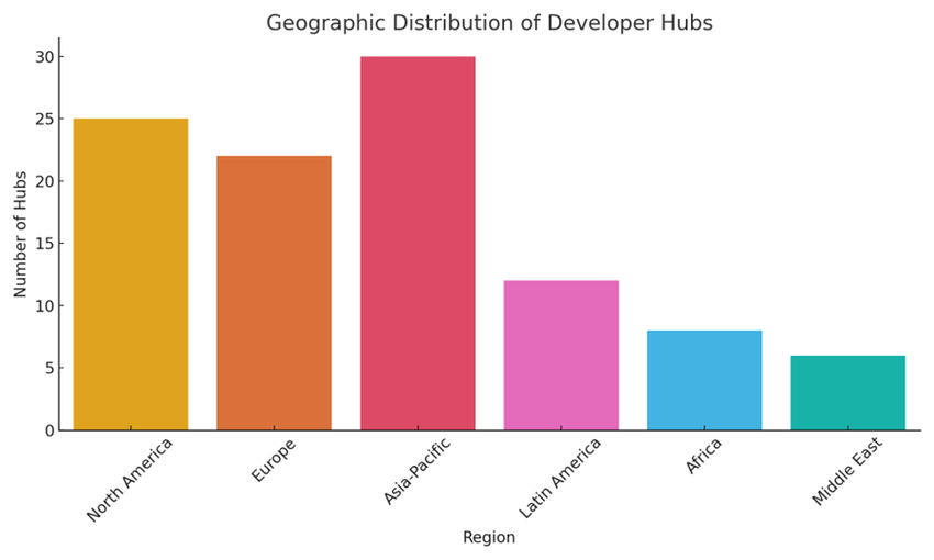 This chart highlights the regional presence of developer hubs across the globe, indicating where ecosystems are establishing a physical or community-driven footprint to support builders.