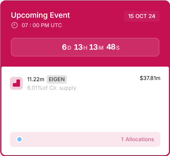 The macro momentum for EIGEN is driven by the upcoming 11.22 million EIGEN token unlock. These tokens are roughly worth $37.81 million, representing 6.01% of the circulating supply.