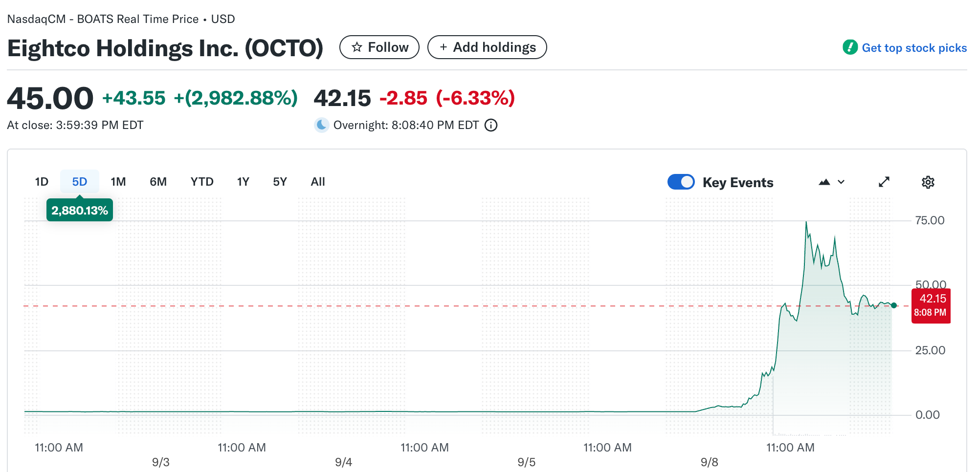 On Monday, Eightco shares closed at $45.08 after trading as low as $1.43 only three days earlier. The stock briefly hit an intraday high of $83.12, representing a gain of more than 5,000% at one point during the day. The surge followed Eightco’s announcement that it raised $250 million through a private placement to purchase Worldcoin (WLD) tokens.
