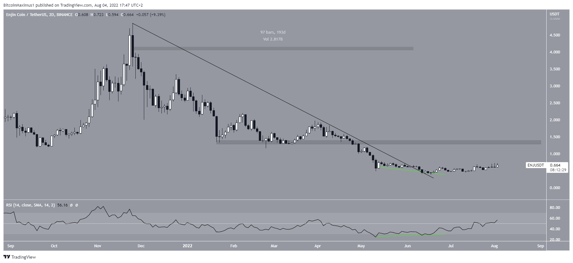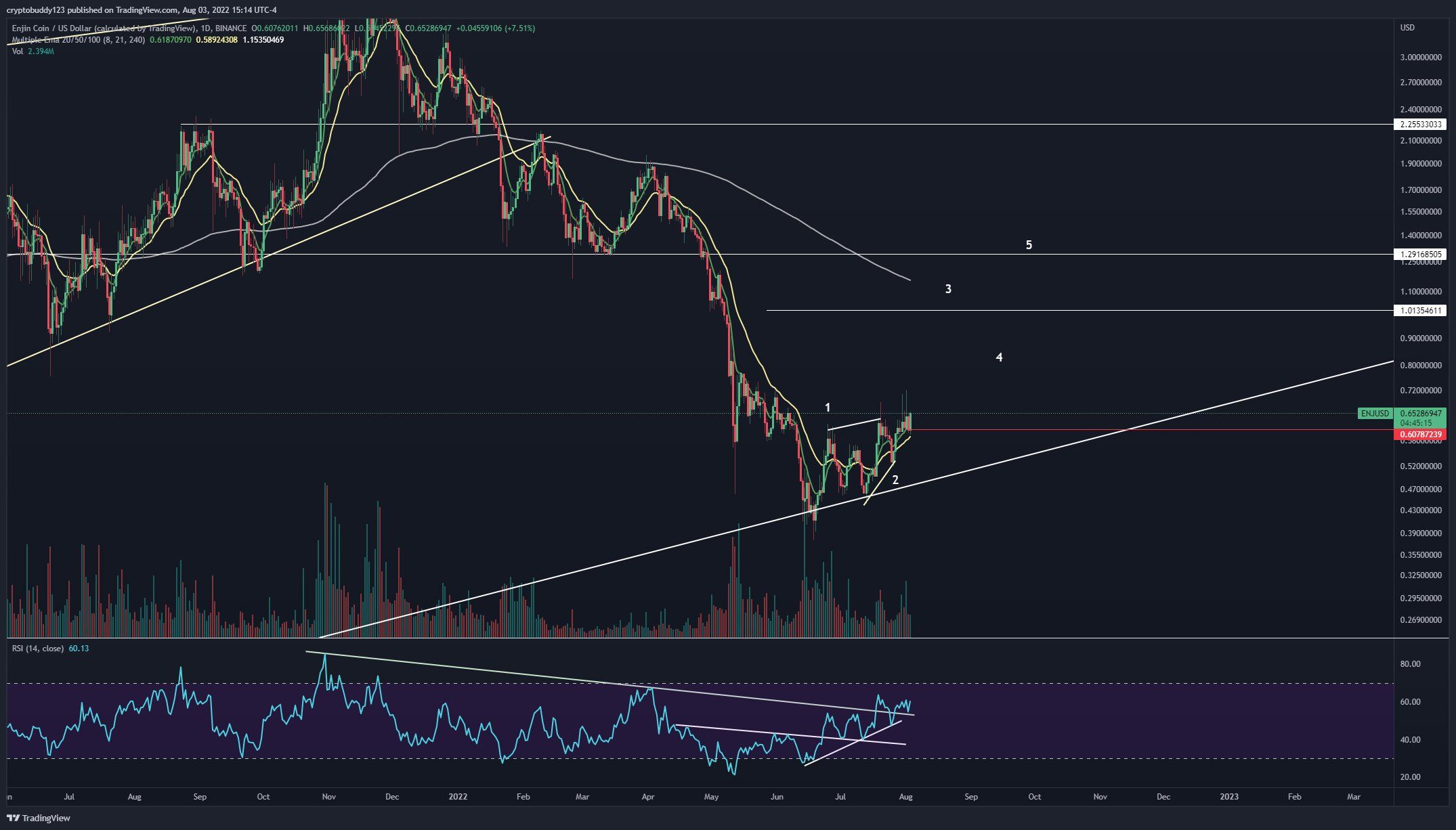 Cryptocurrency trader @cvotrades tweeted a chart of ENJ, stating that the price could rapidly increase towards $1.
