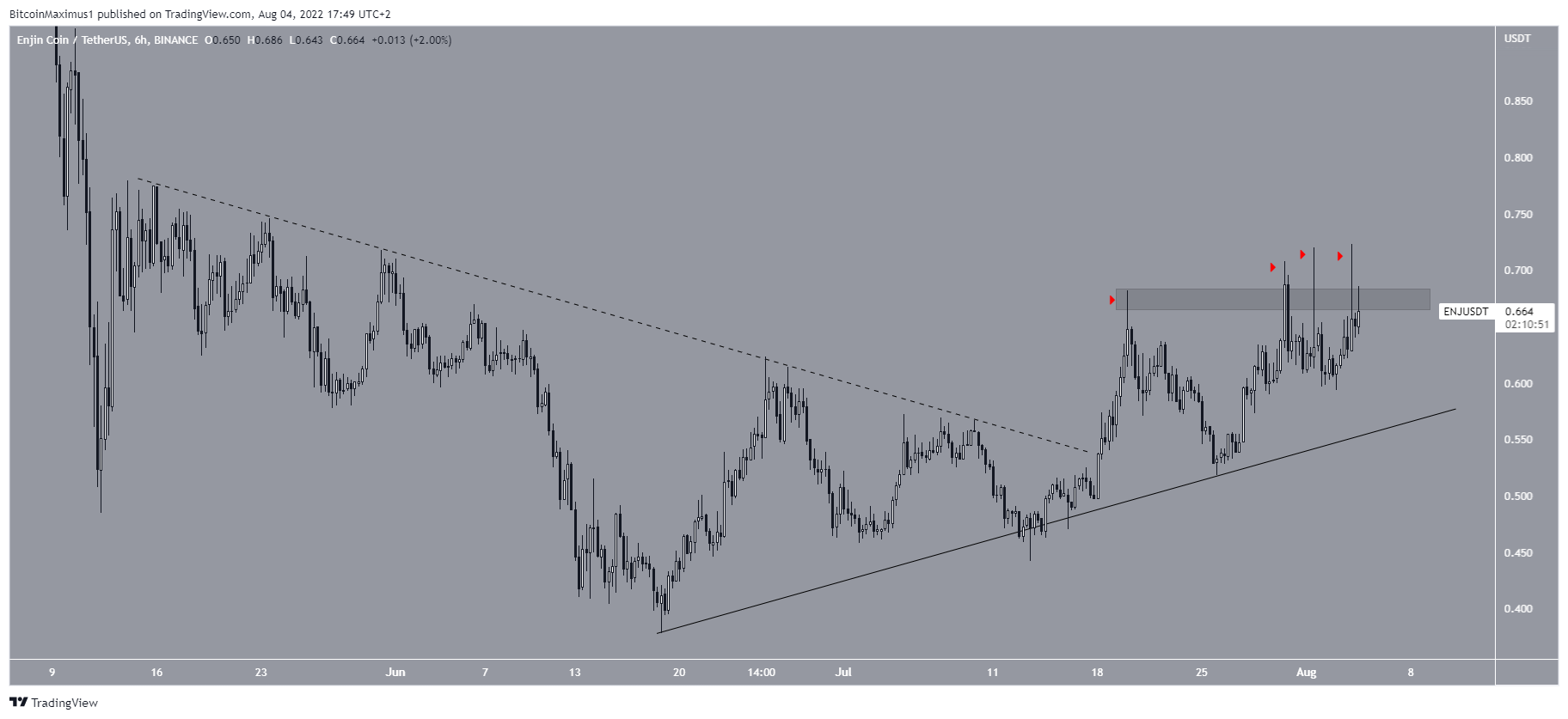 Finally, the six-hour chart shows that ENJ has been following an ascending support line since June 20, and broke out from a short-term descending resistance line (dashed).