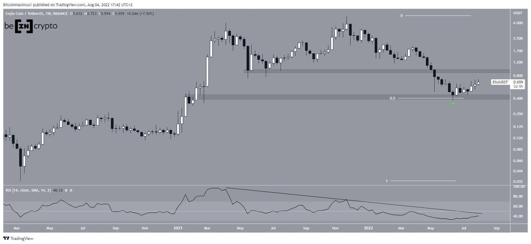 ENJ has been falling since reaching an all-time high price of $4.85 in Nov. The downward movement so far led to a low of $0.378 in June.Â
