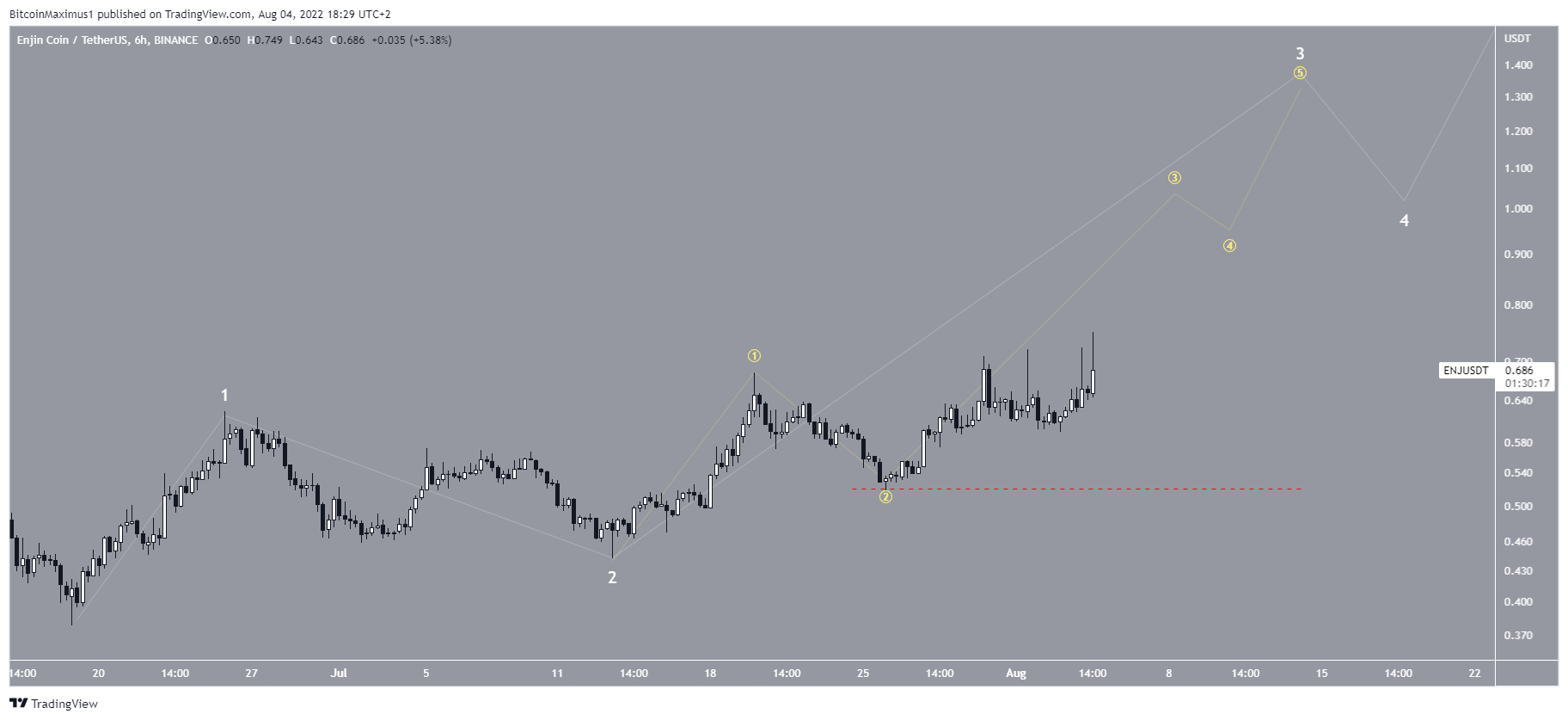 As for the short-term count it is possible that ENJ began a new five-wave upward movement (white) on June 18. If correct, it is mired in a 1-2/1-2 wave formation, meaning that it will soon accelerate its rate of increase inside wave three.