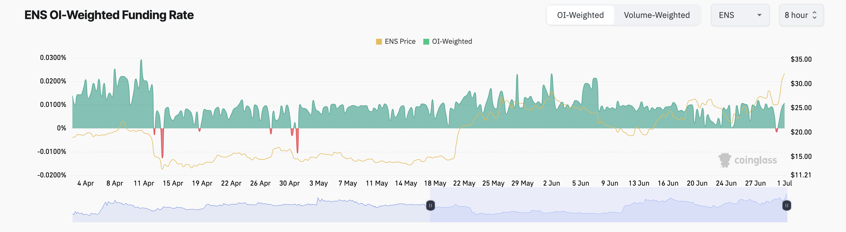 ENS’ positive funding rate across cryptocurrency exchanges confirms that these new market entrants demand long positions. As of this writing, the token’s funding rate is 0.01%.