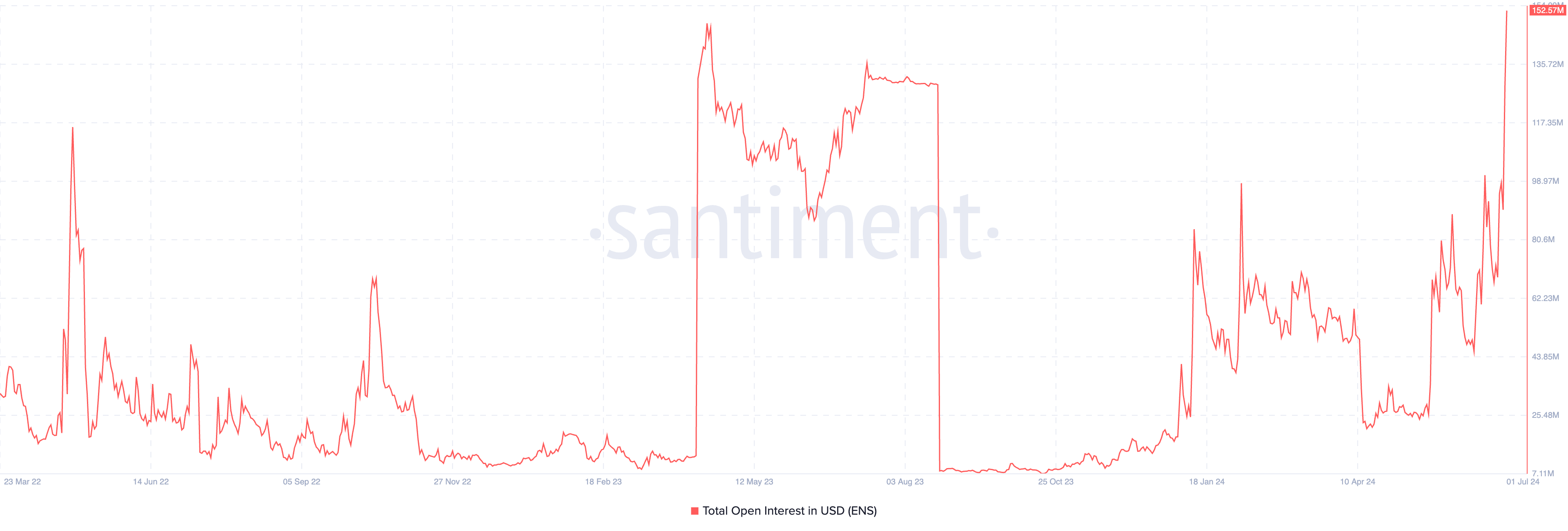 As of this writing, ENS’s open interest is $153 million, its highest level since the token launched. It initiated its most recent uptrend on June 25 after falling to a low of $73 million. It has since risen by over 105%.