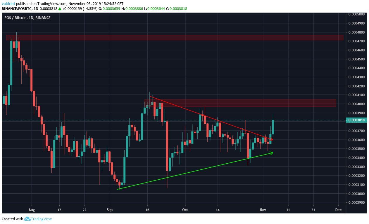 However, the breakout from the symmetrical triangle confirms this upward movement in EOS/BTC, while EOS/USD has yet to break out above its descending resistance line.