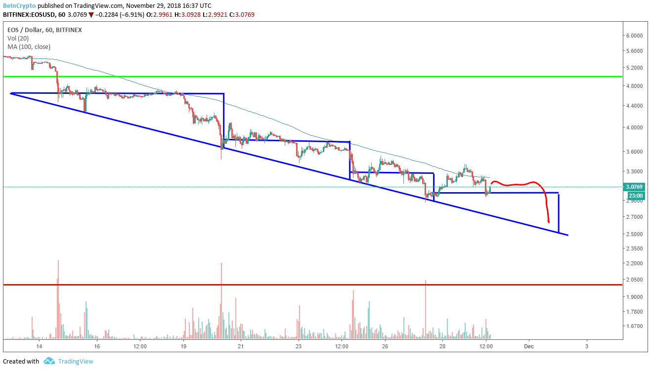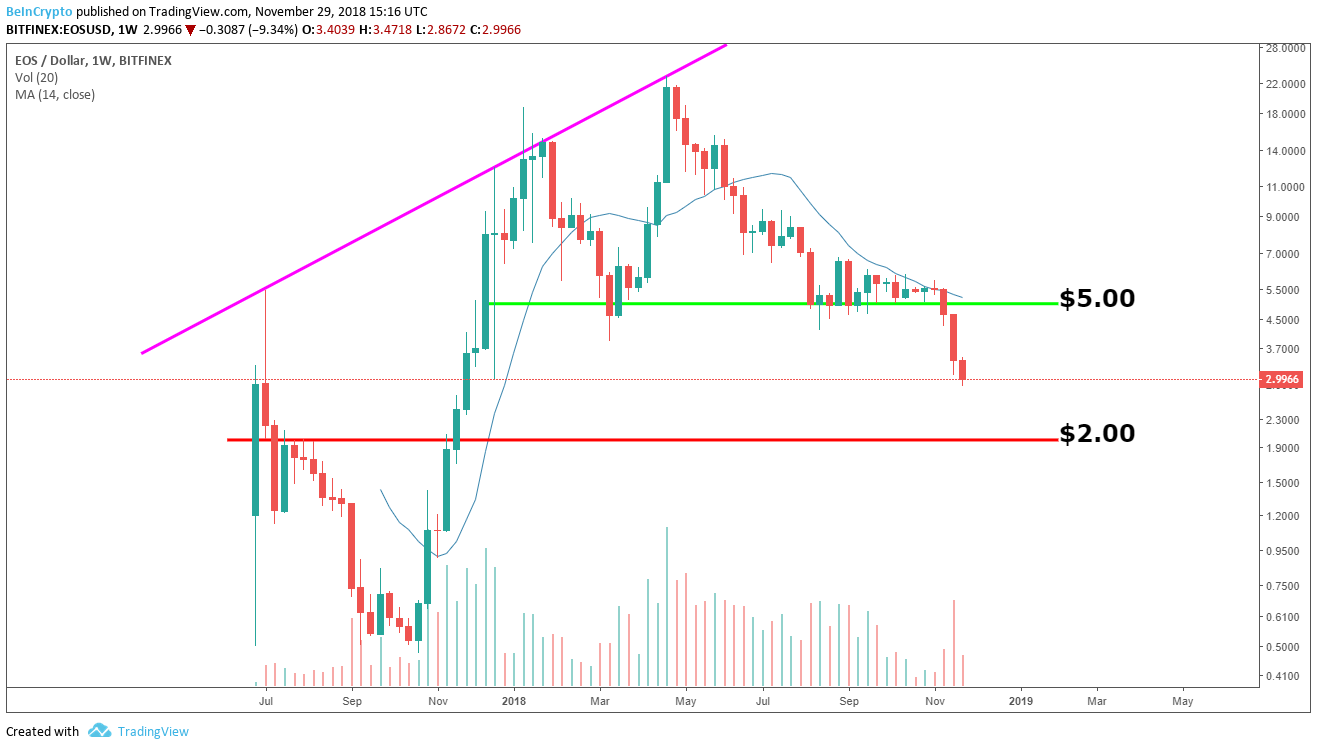 Since launching when its genesis block was mined in June of this year, EOS has seen a steady decline following the rest of the market. Two weeks ago, it broke through the $5 support and is today trading at just $3 — the same price it was trading at exactly one year ago.