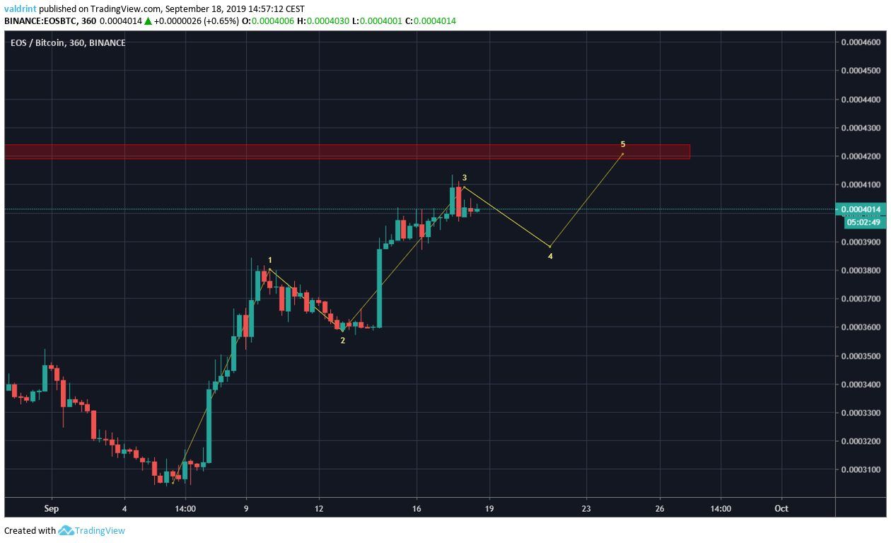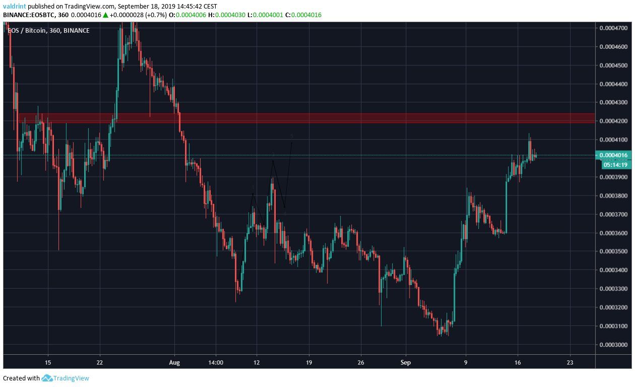 On September 7, 2019, the EOS price reached a low of 30,740 satoshis. A rapid upward move followed and EOS reached a high of 38,410 satoshis on September 9. After a brief decrease, EOS began another upward move, reaching highs above 41,000 satoshis.